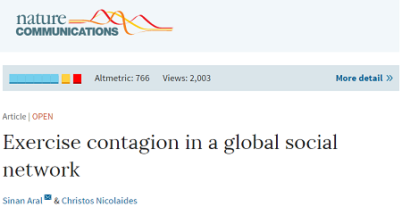 除了跑步延长寿命相关的研究,小编还注意到,最近Nature Communications杂志上发表一篇关于跑步能“传染”的论文(题目:Exercise contagion in a global social network)。研究证实,运动具有社会传染性。一个人的跑步习惯会影响其朋友的跑步习惯。